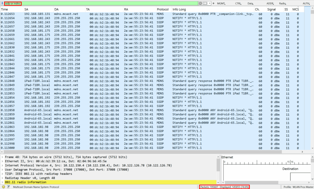 If my CWAP studies taught me one thing, it’s that packets don’t lie. With modern WLAN systems, it is relatively easy to perform a packet capture on a specific AP. I initiated a capture and quickly identified the root cause: a flood of multicast packets originating from guest and BYOD devices. These packets included SSDP “NOTIFY” and mDNS traffic.